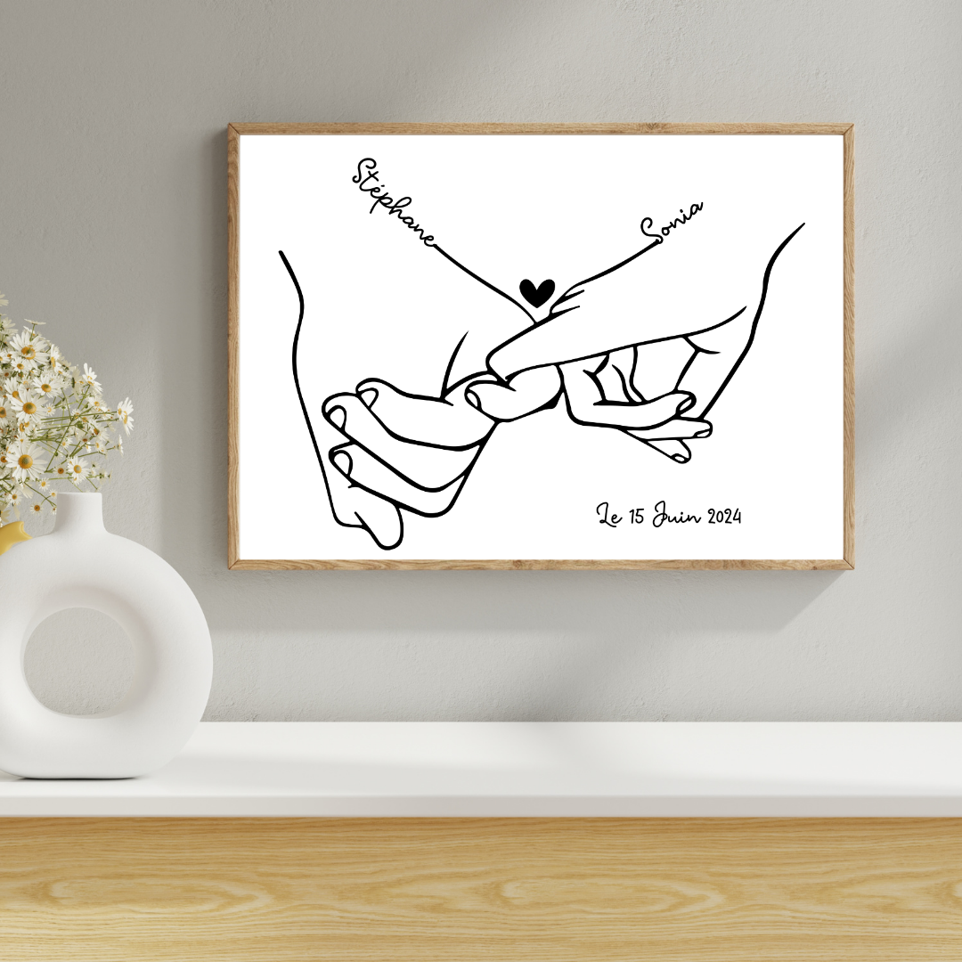 Créée avec soin dans nos ateliers, cette affiche minimaliste représente les mains des mariés dessinées d’un seul trait, symbole fort d’union et de complicité.