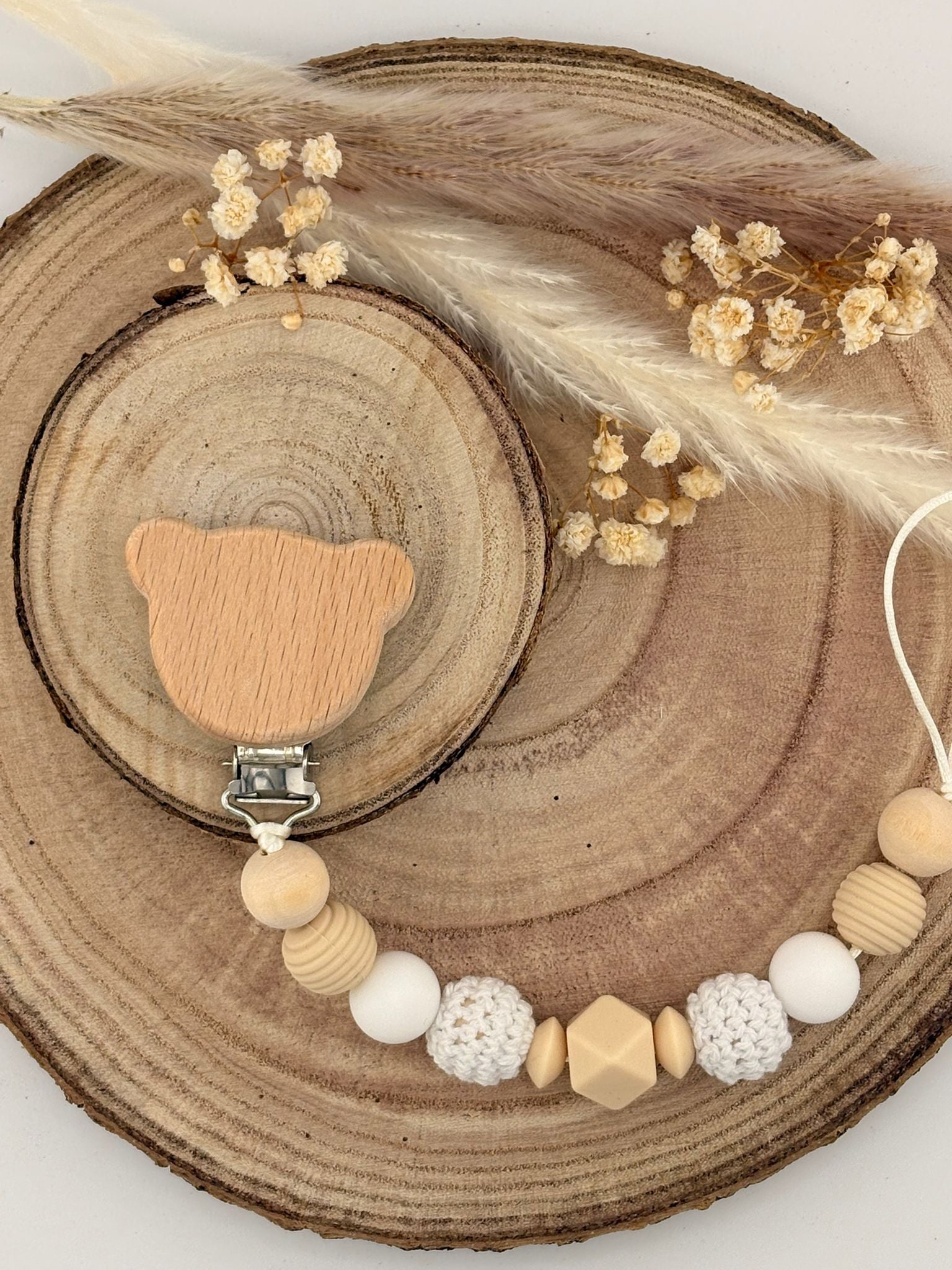 Confectionnée à la main dans nos ateliers, chaque attache tétine est une pièce unique, pensée pour les tout-petits et leurs parents.