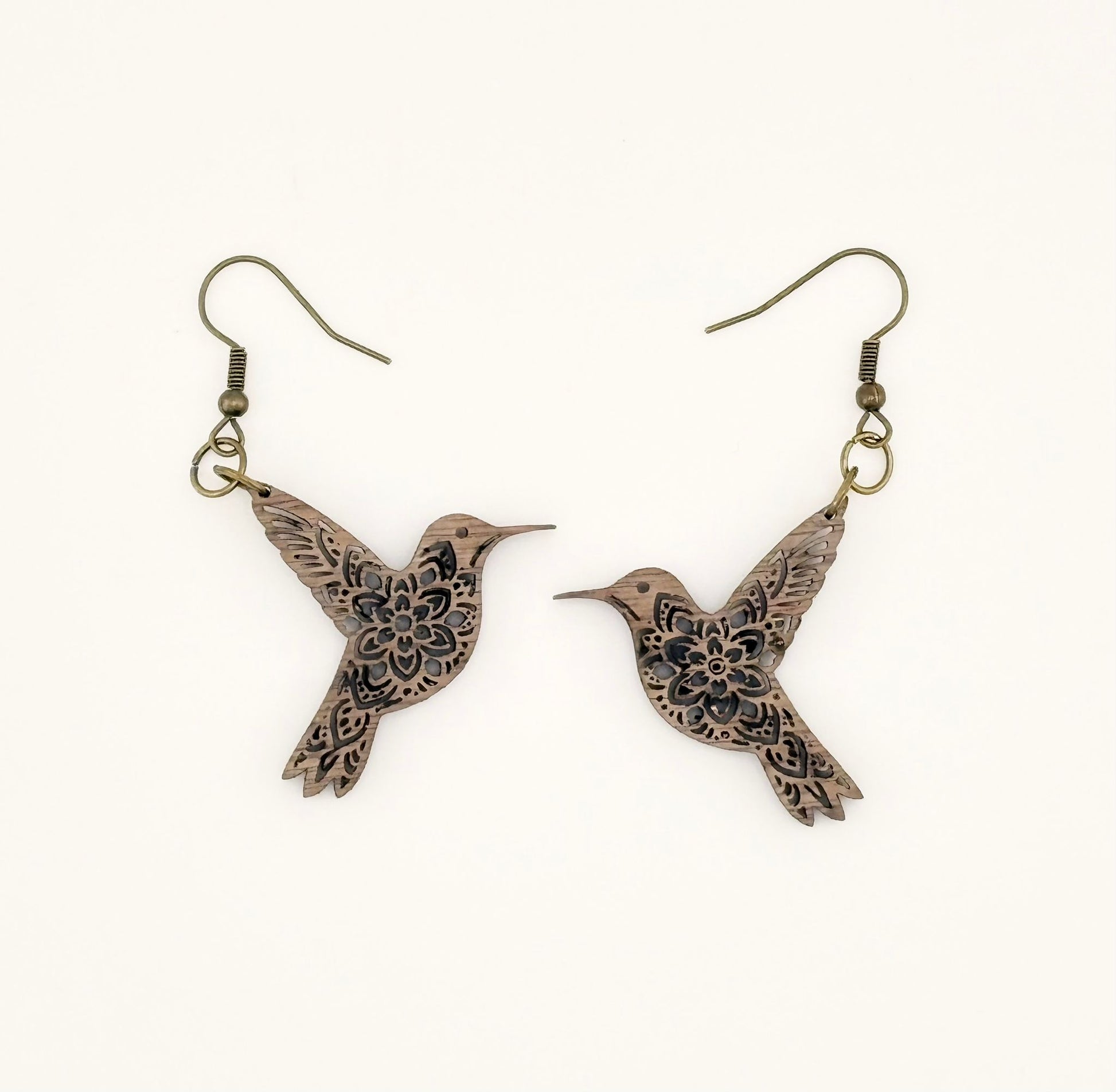 Boucles d’oreilles colibri Mandala en noyer – Légèreté et poésie 🌿🐦✨