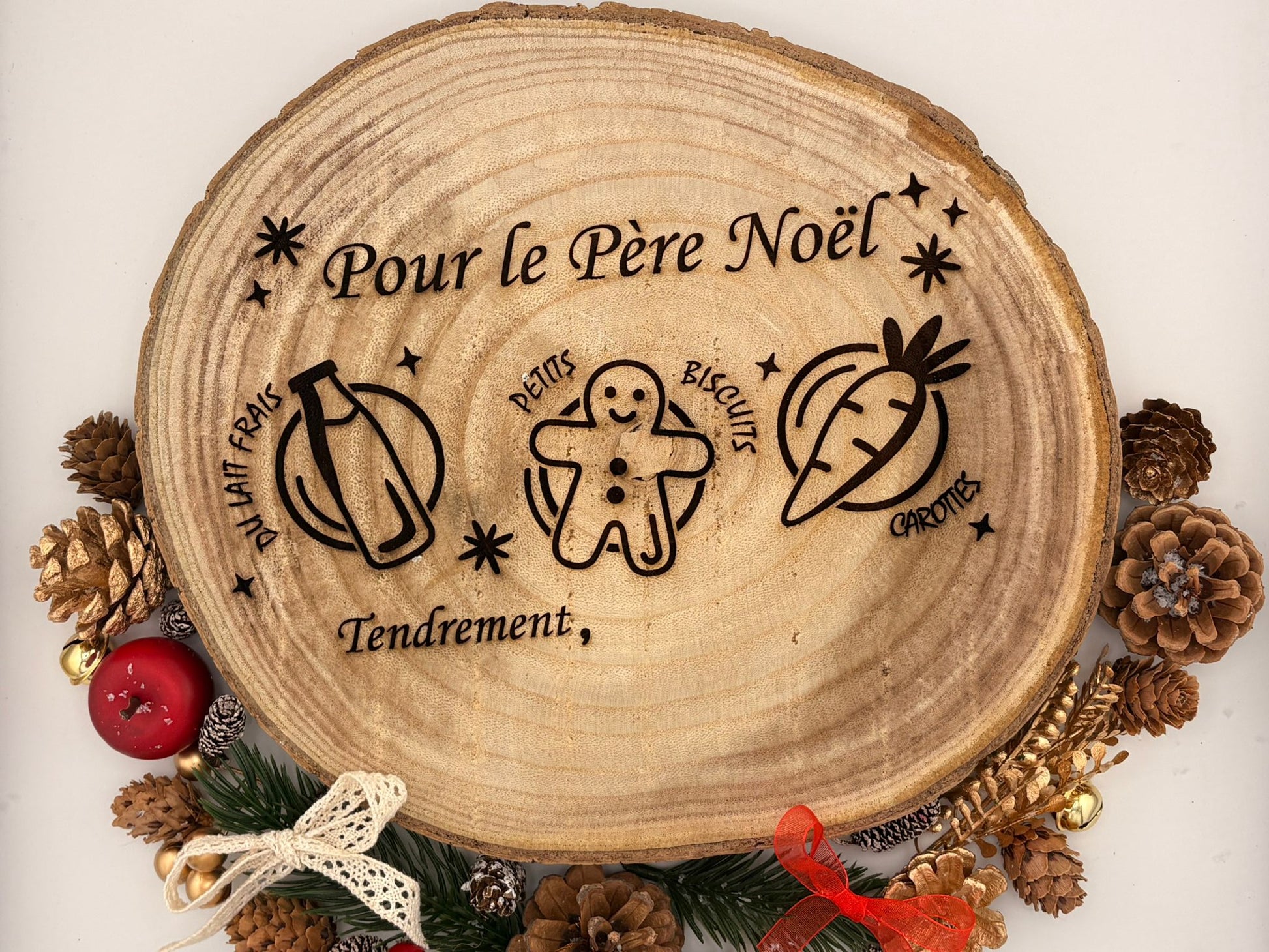 Fait main avec amour dans nos ateliers, cette planche en bois est conçue pour accueillir le verre de lait, le gâteau et la carotte destinés au Père Noël et à ses rennes.